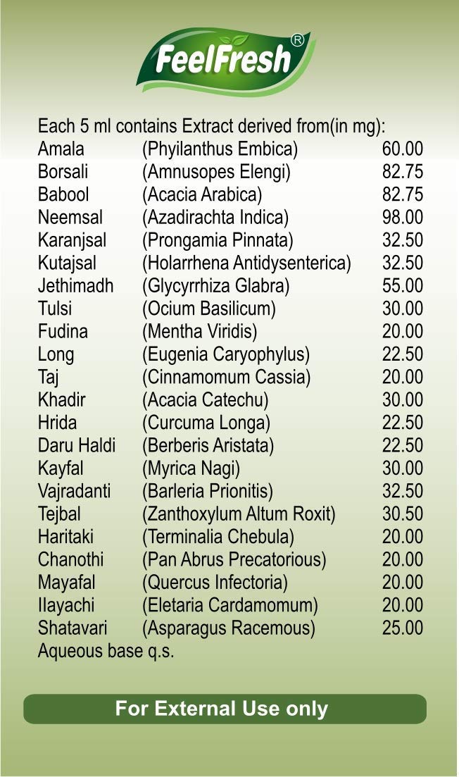 Feelfresh-is combination of 22 innocuous herbs, totally harmless, contains no alcohol, no artificial colour essence flavour, no synthetic ingredients