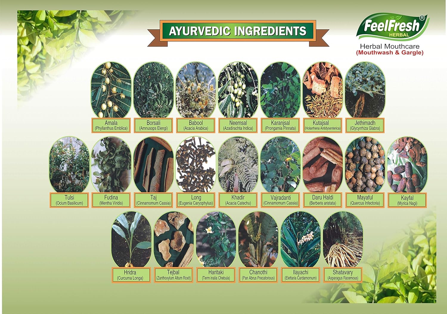 Feelfresh-is combination of 22 innocuous herbs, totally harmless, contains no alcohol, no artificial color essence flavor, no synthetic ingredients