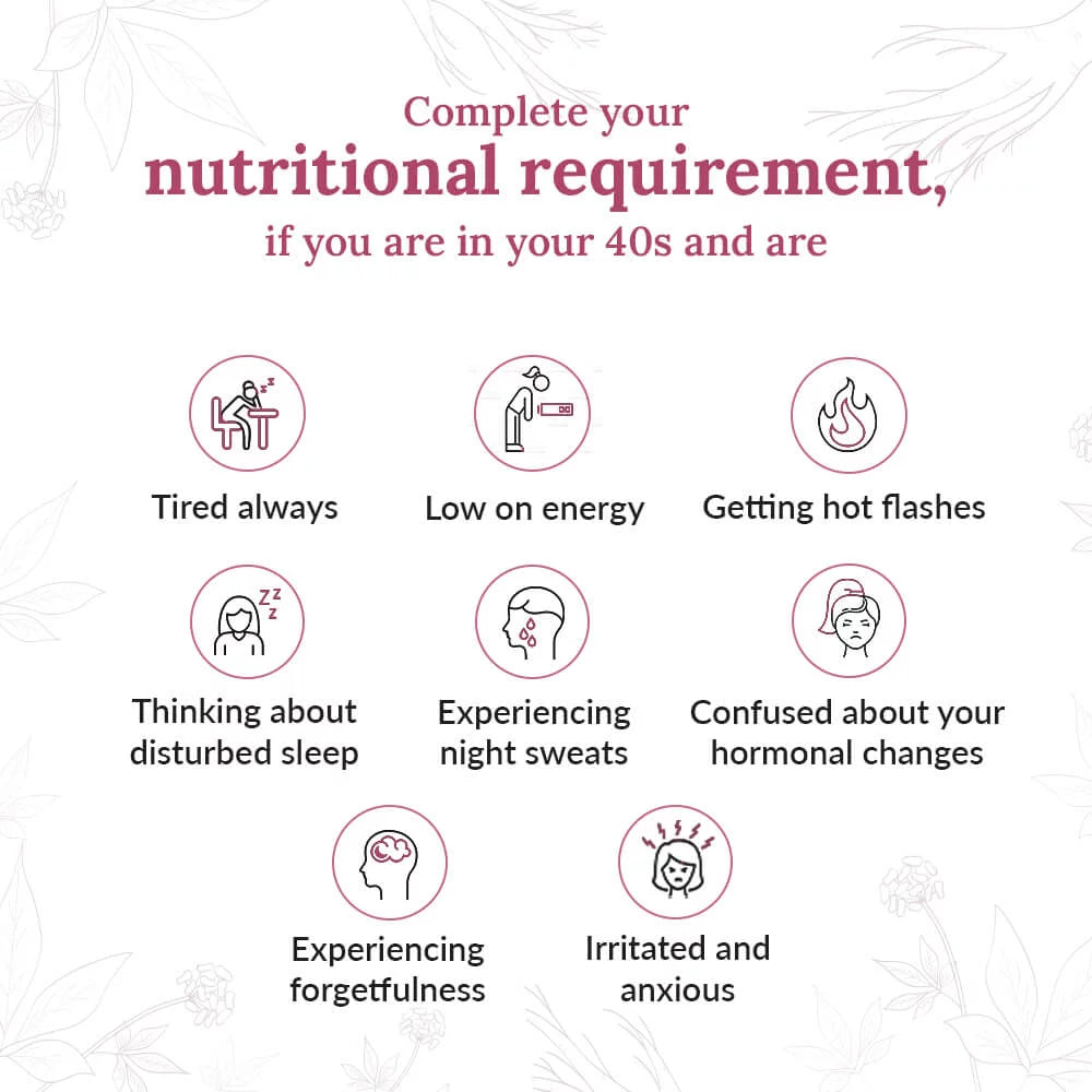 - **Hormonal Balance:** Many Ayurvedic ingredients are included to help balance hormones, which can fluctuate in women over 40, especially during perimenopause and menopause.