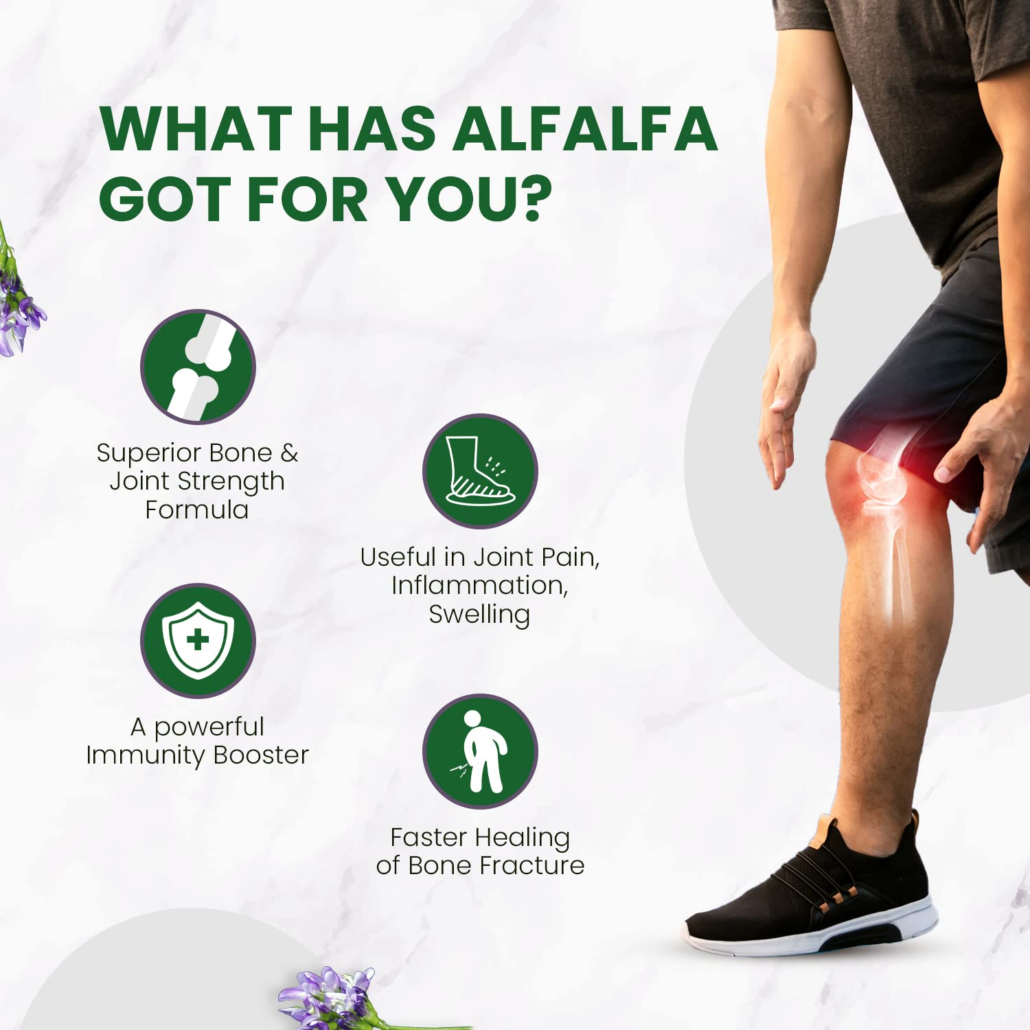 ANTI-INFLAMMATORY: Alfalfa is a great source of vitamins B & C, as well as calcium and antioxidant compounds which can help minimize inflammation in the joints and around the body, while strengthening overall immune system.