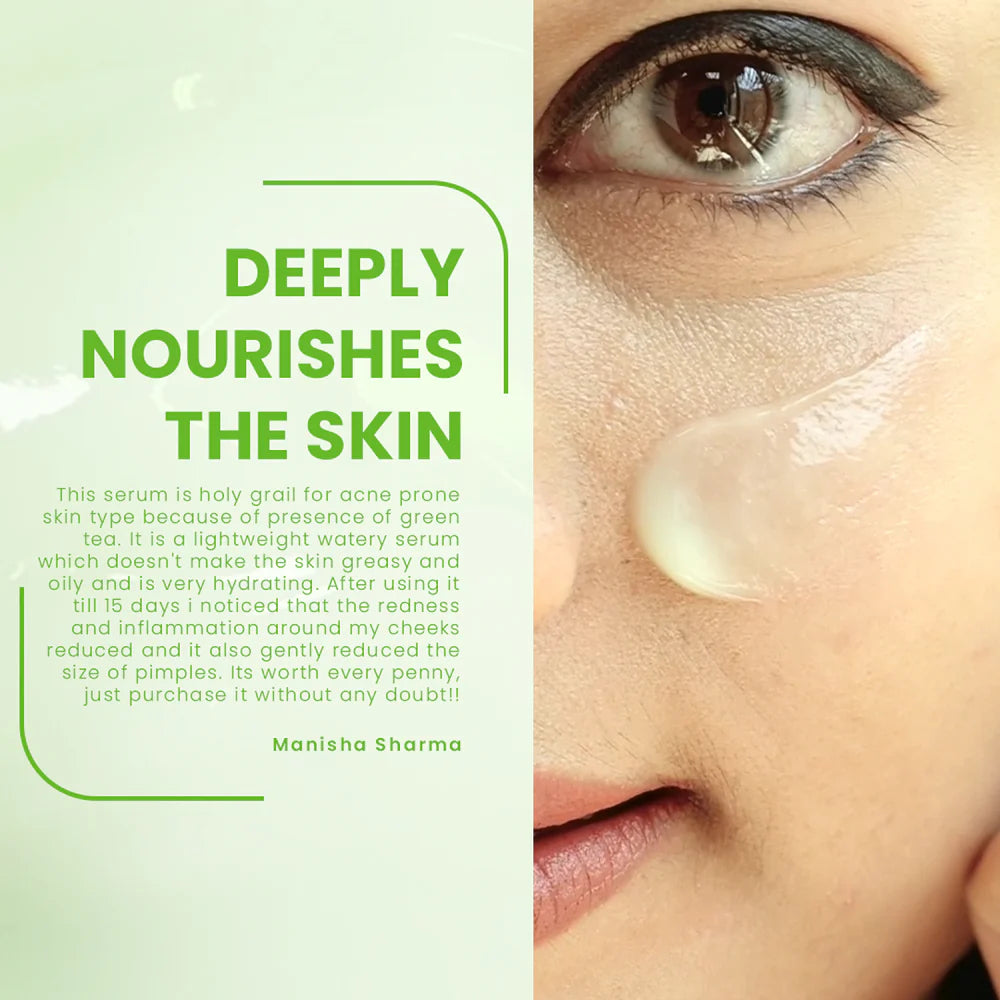A lightweight serum combining aloe vera, green tea extract, and niacinamide—designed to hydrate, soothe inflammation, minimize excess sebum, fade pigmentation, and reduce pore appearance. It's marketed as non-sticky and suitable for sensitive or acne-prone skin types.