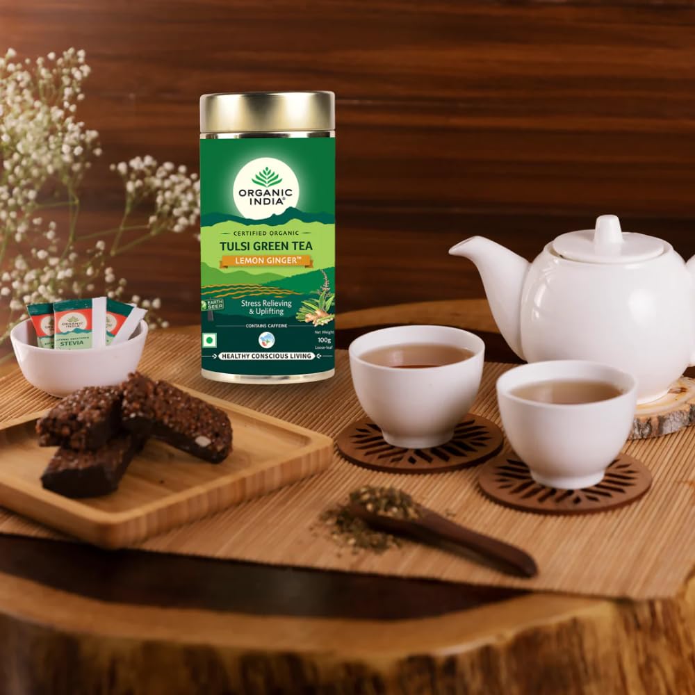 Organic India Tulsi Green Tea Lemon Ginger is a flavorful herbal infusion that combines the benefits of green tea, Tulsi (holy basil), ginger, and lemon. This blend offers a refreshing taste along with several health advantages.
