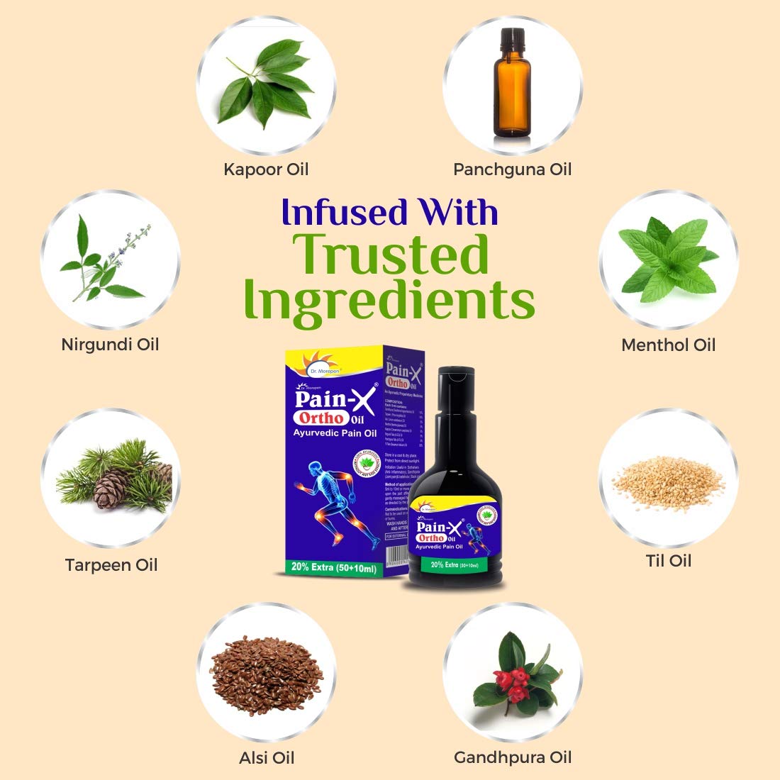 We Present to you Pain-X Ortho Oil, an effective Ayurvedic Pain Relief Oil that helps to provide quick relief from pain, inflammation, soreness and stiffness without any side effects. Born from a blend of various essential ayurvedic ingredients such as wintergreen, flaxseed, sesame, menthol, Camphor oil, etc. it helps to improve muscle flexibility, strengthen joints, increase blood circulation as well as promotes self-healing of affected region over time.