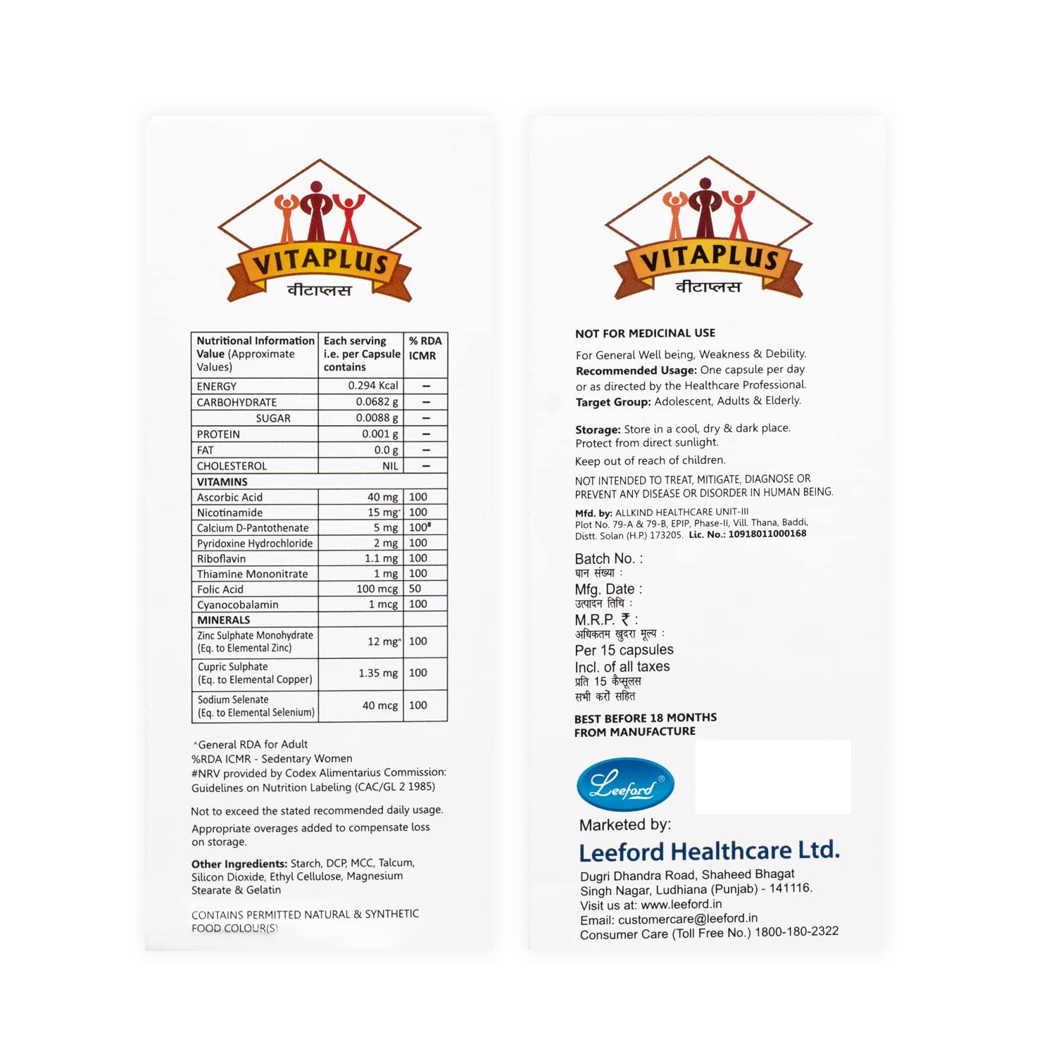 Leeford Vitaplus Capsules With B- Complex, Vitamin C & Zinc Sulphate , Enhances Energy And Immunity 15 Capsules Each - Pack Of 10
