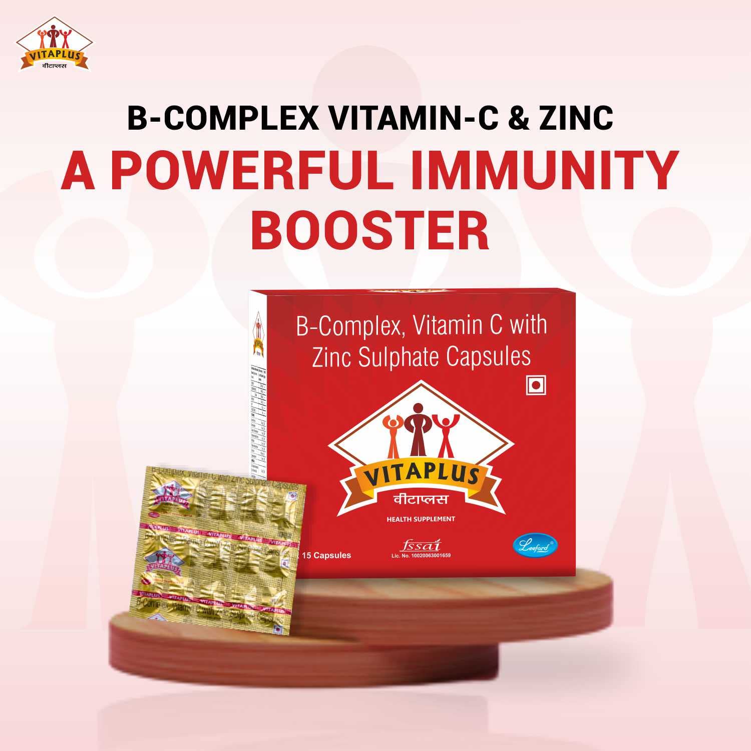 Vitaplus capsules have B complex, Vitamin C, and zinc capsules for improving body functions and also help in improving our energy level and easily do our daily normal work with more energy. It helps to strengthen a healthy immune system. It also helps to enhances skin radiance, well-being of hair and fortifies bones.