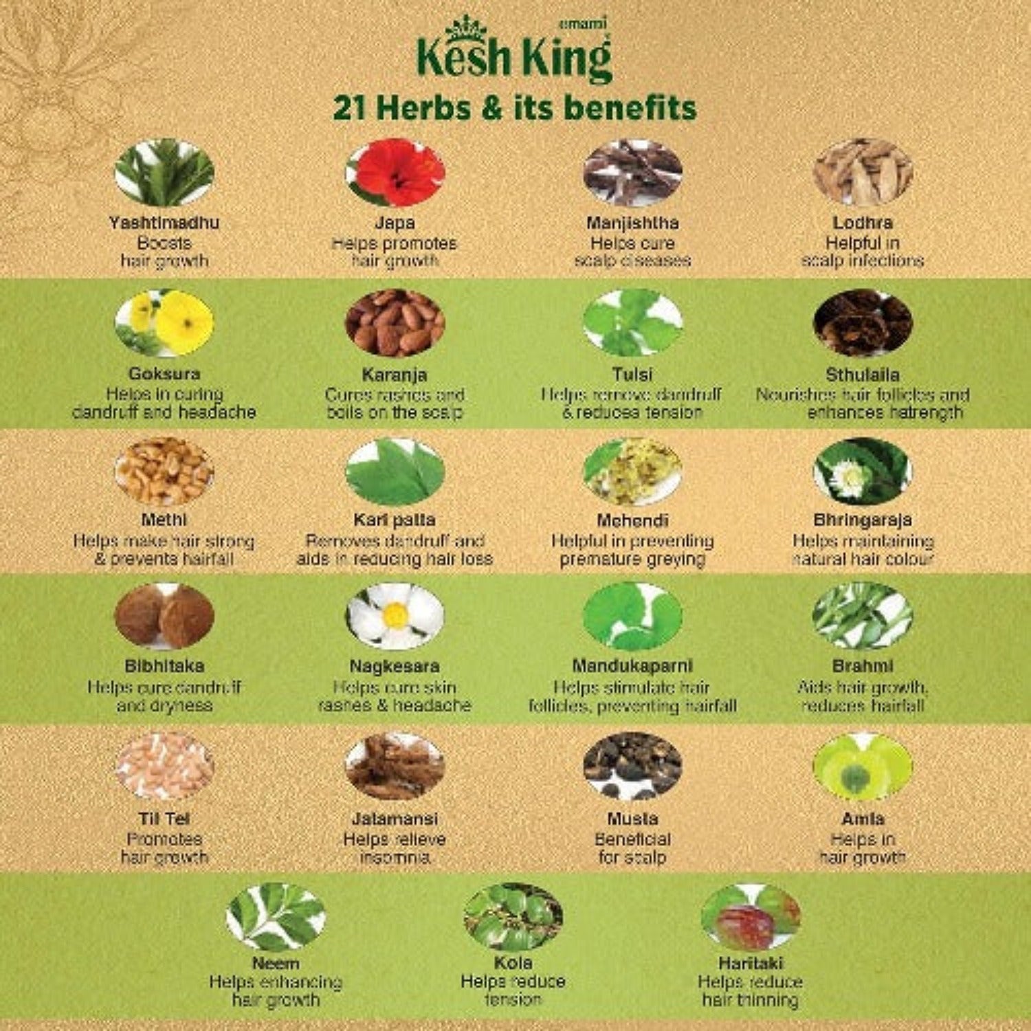 Kesh King Scalp and Hair Medicine Ayurvedic Oil is a herbal oil prepared using a combination of 21 herbs. It helps to reduce hair fall and promote regrowth.