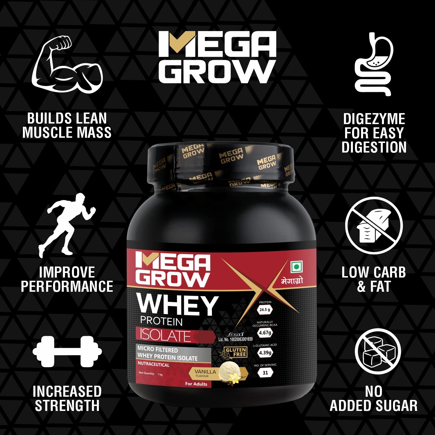 Leeford Megagrow Isolate Whey Protein Powder Vanilla Flavored With Shaker 1 Kg