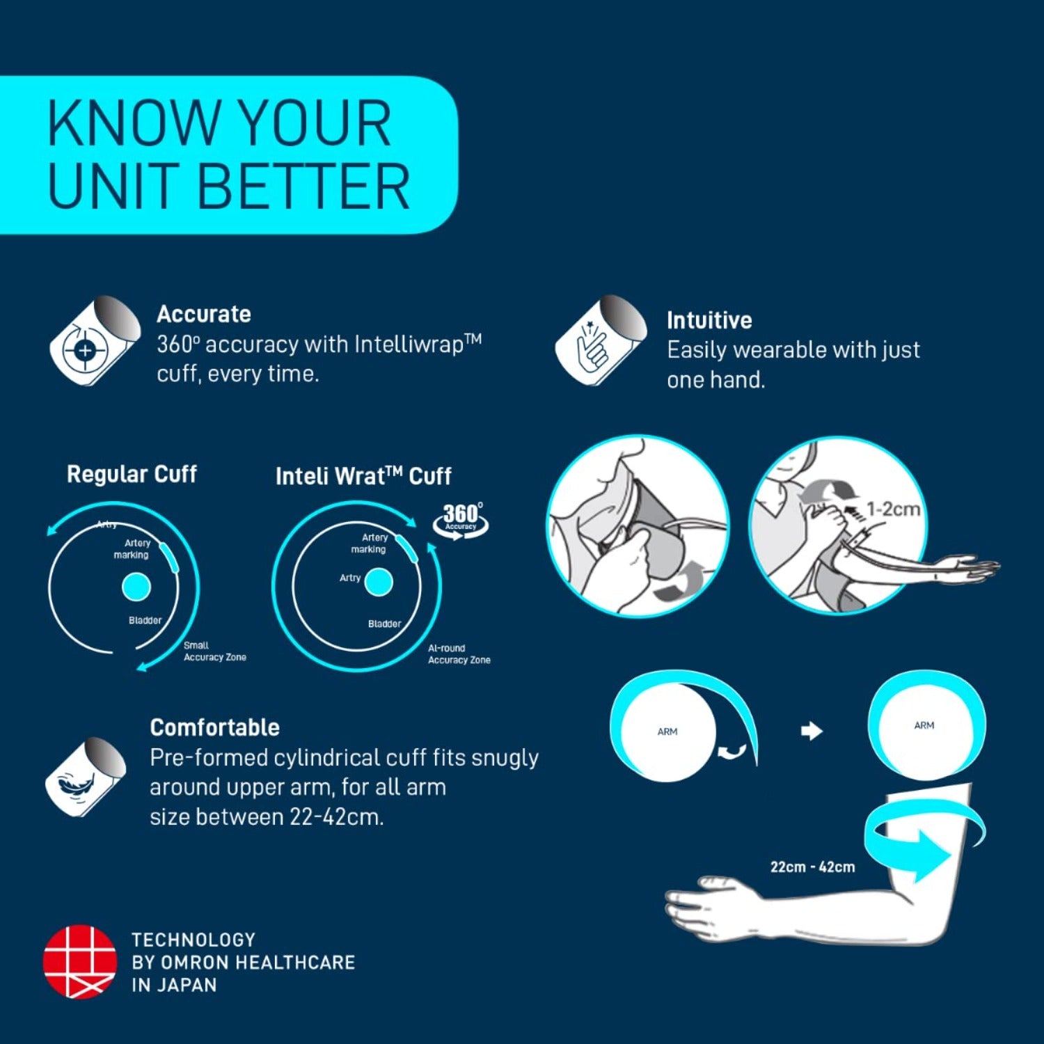 Omron digital blood pressure besides being clinically validated are also known to give the most accurate BP readings. Omron HEM 7156 digital BP check machine now comes equipped with the 360° Accuracy IntelliWrap™ Cuff for first time users which can be worn with just one-hand. Made to fit most Asian arm sizes the IntelliWrap Cuff ensures highly reliable BP readings no matter how it is worn.