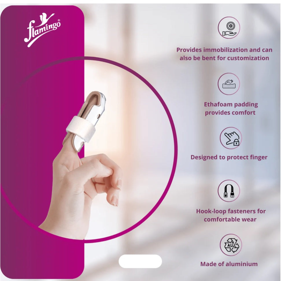 Product Description Malleable yet rigid aluminium splint ensure holding finger in neutral position, can be mould in desire shape for better fitment and support. EVA foam on inner lining of splint ensure cushioning effect. Common for left and right finger.