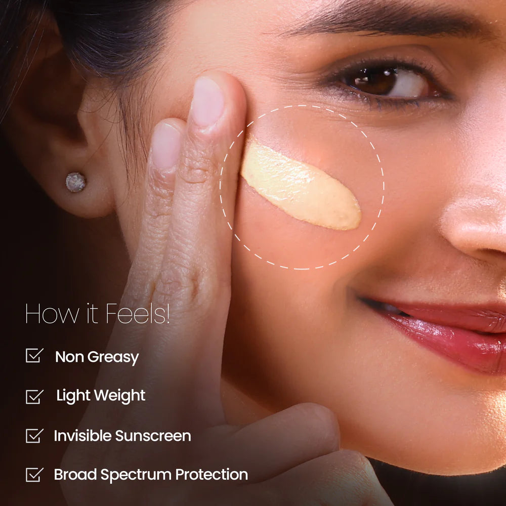 This is a tinted gel-lotion sunscreen with SPF 50+ and PA++++, designed to offer broad-spectrum protection along with blue light filtering.