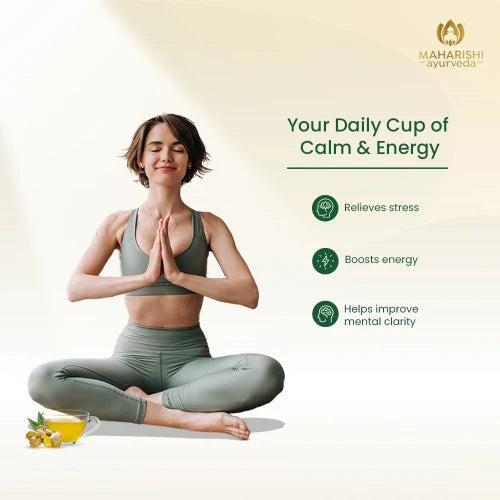This blend combines adaptogenic tulsi (holy basil), antioxidant-rich green tea, soothing ginger, and lemongrass to support stress relief, wellbeing, and immunity. Ingredients and benefits match the official product description