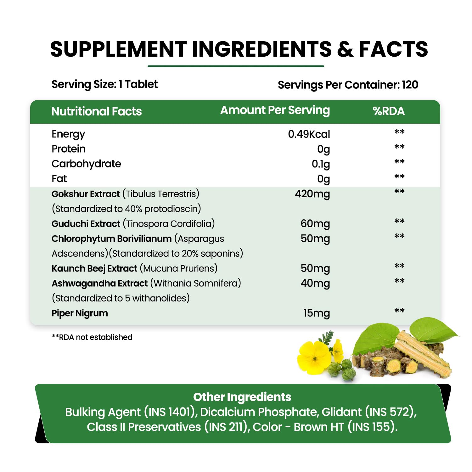The supplement contains ingredients like Gokshur extract, Guduchi extract, Kaunch beej extract, and Ashwagandha Extract that enhance help you stay active and energised.