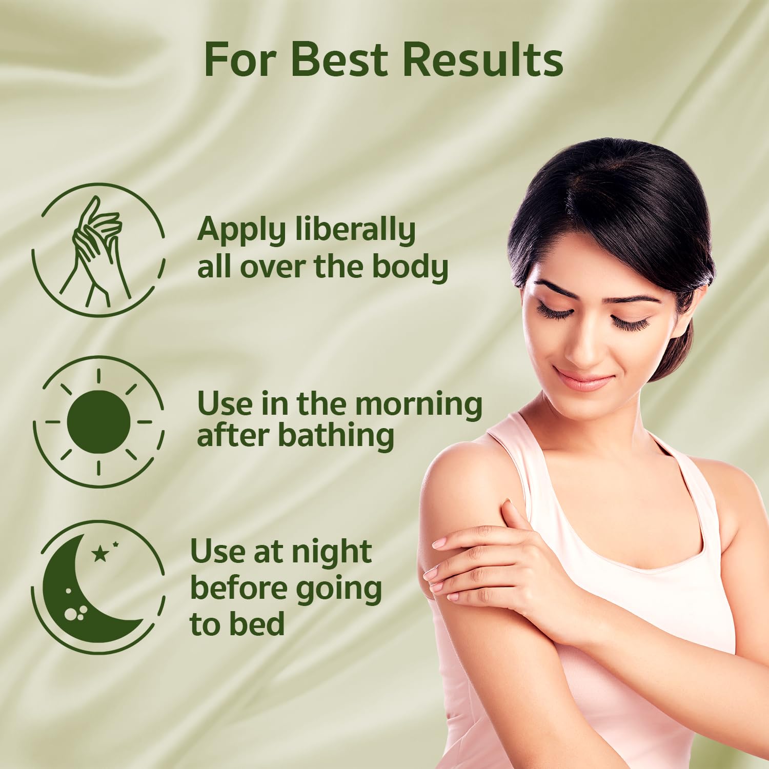 Apply this lotion gently all over the body, slowly massaging it in. It is best used after bathing, when your skin is most receptive to hydration.