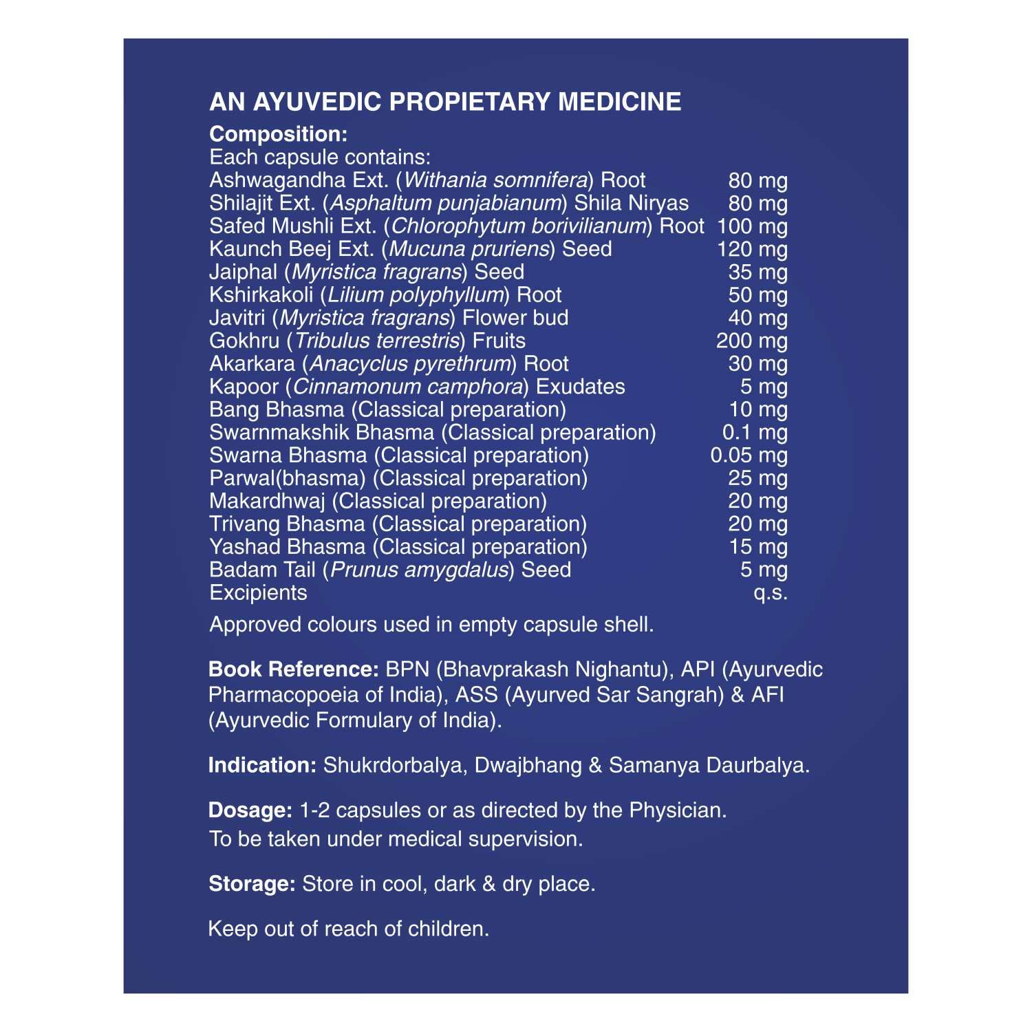 Ashwagandha Ext. (Withania Somnifera) Root, Shilajit Ext. (Asphaltum Punjabianum) Shila Niryas, Safed Mushil Ext. (Chlorophytum borivilianum) Root, Kaunch Beej Ext. (Mucuna Pruriens) Seed, Jaiphal (Myristica fragrans) Seed, Gokru (Tribulus Terrestris) Fruits, Kapoor (Cinnamonum camphora) Exudates, Badam Tail seed (Prunus amygdalus)xt.
