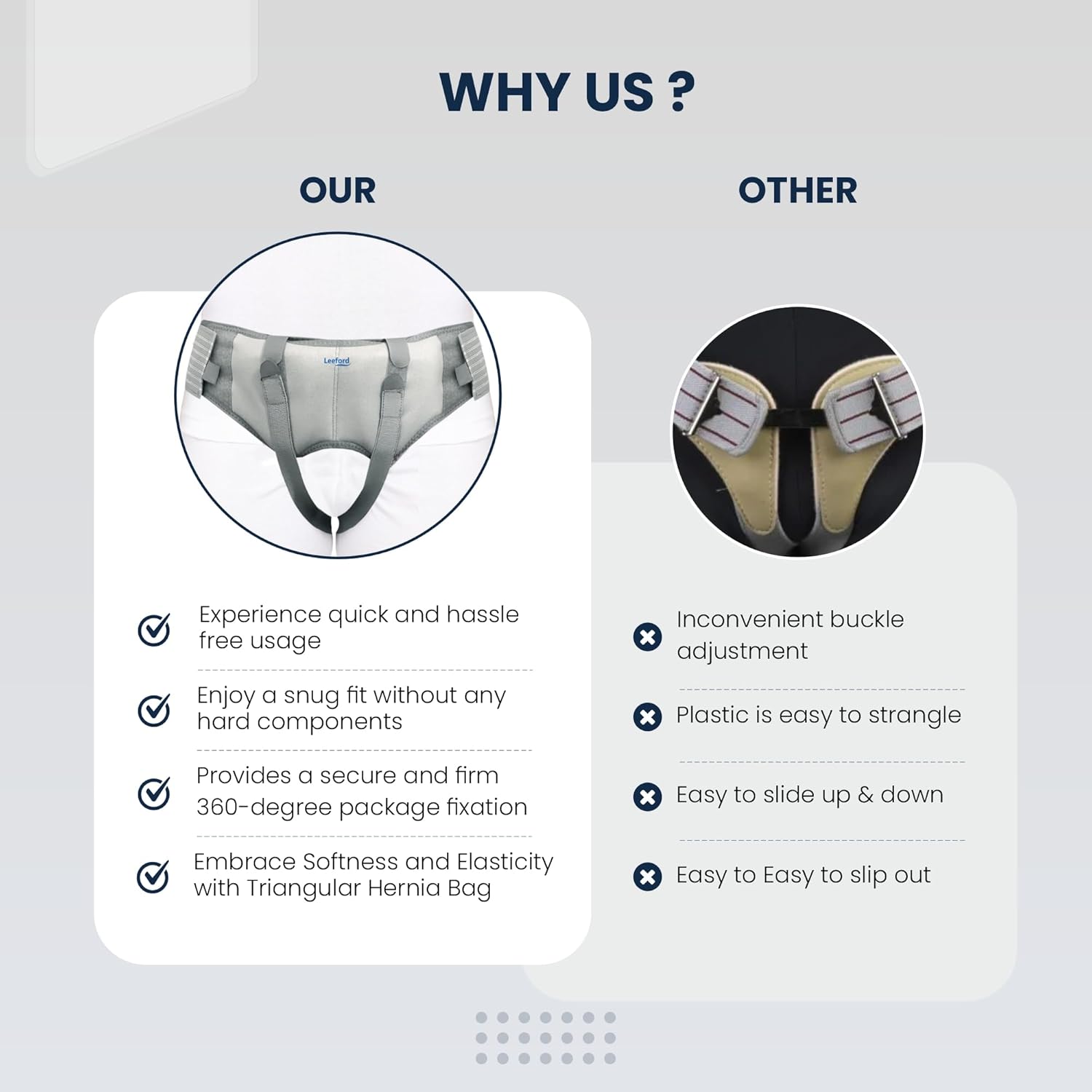 Leeford Hernia Belt is made from durable monofilament nylon elastic and heat-resistant rubber for long-lasting use. Its high elasticity and broad hook loop closure provide a secure and comfortable waist fit. The breathable material and Etha-foam pads offer superior comfort and effective compression on the herniated area. Specifically designed for inguinal hernias, the anatomically shaped pad, and two detachable foam pads provide excellent back support and customizable pressure. Adjustable Velcro straps and elastic hip straps ensure a perfect fit, while discreet design allows inconspicuous wear under clothing. Easy to use and remove, follow simple instructions for optimal hernia support. Choose the Leeford Hernia Belt for enhanced comfort and well-being.