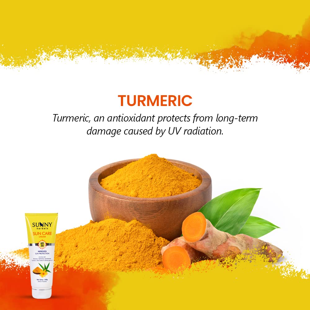 Turmeric, an antioxidant, protects from long-term damage caused by UV radiation while sandalwood and aloe vera act as natural sunscreens