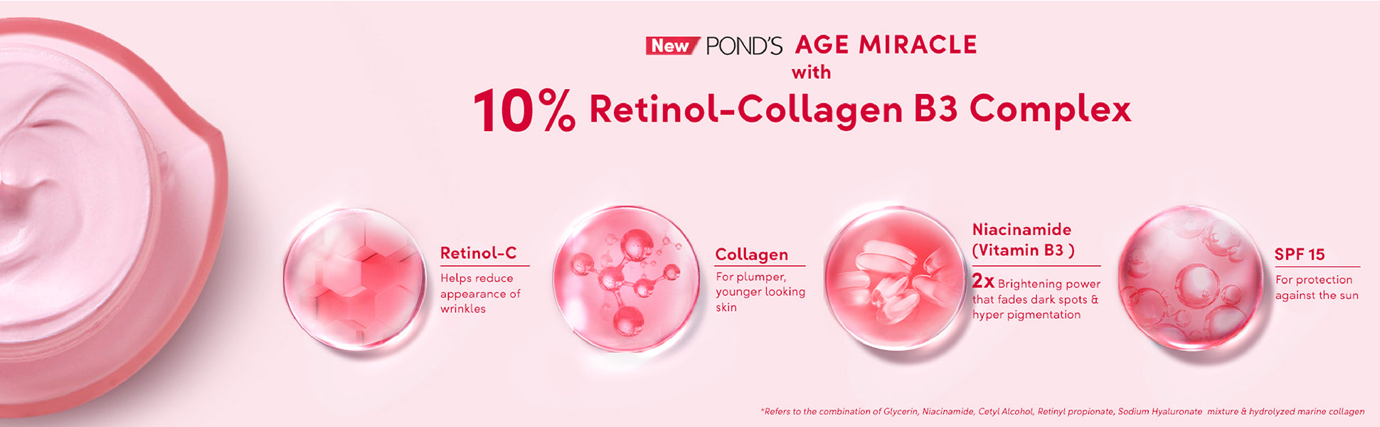 The New POND'S Age Miracle Range with 10% Retinol-Collagen B3 Complex has been created by experts to give youthful flowing skin in 7 days. It fades spots, boosts radiance, and plumps up the skin.