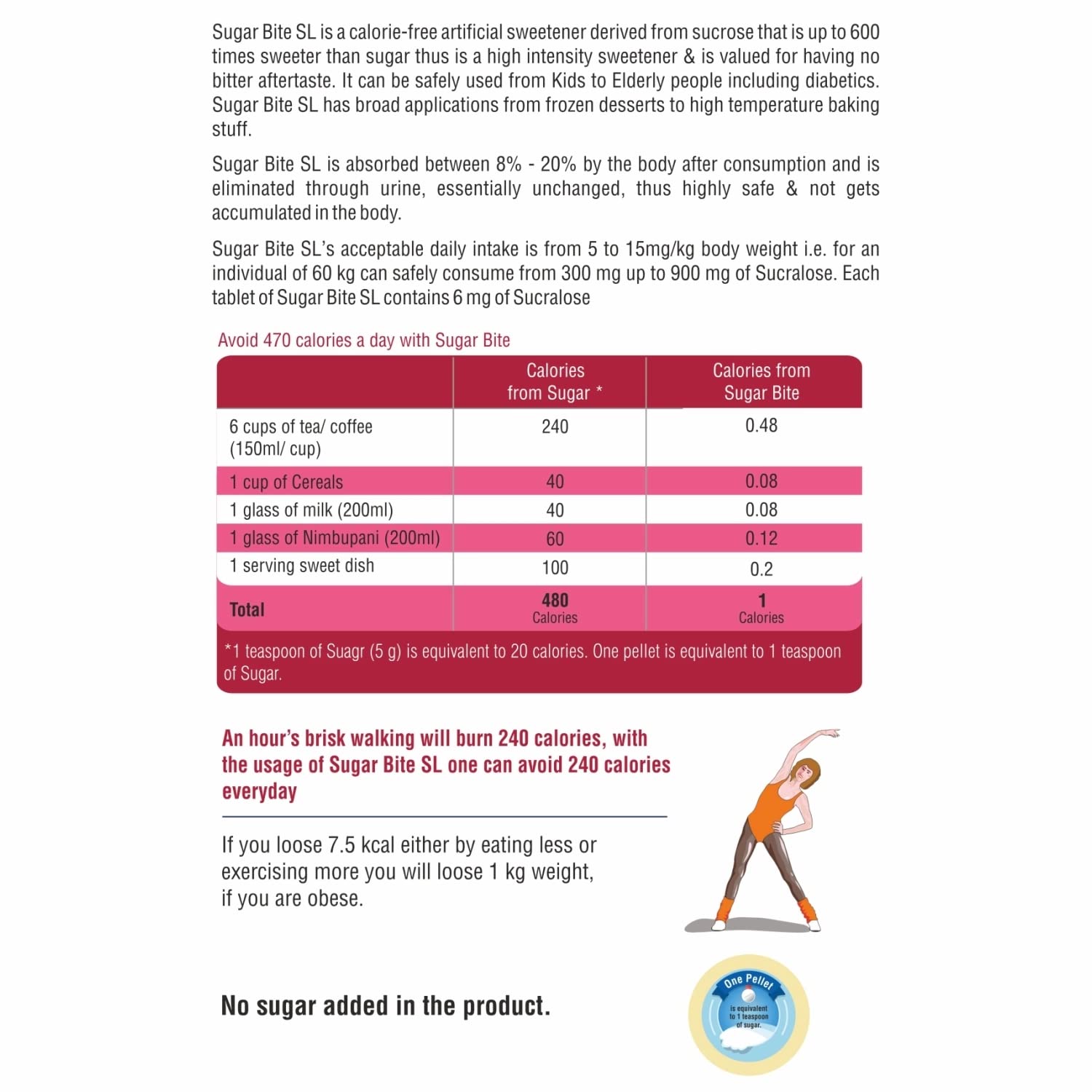 Sugarbite-SL pellets contain Sucralose, a non-nutritive, zero-calorie artificial sweetener & sugar substitute that is helpful for people with diabetes & weight and health-conscious individuals. Sucralose is a chlorinated derivative of sugar & is available in the pellet (small rounded tablets) in Sugarbite-SL that helps to provide adequate sweetness to hot and cold beverages, desserts, cakes, etc. and works as a perfect replacement for sugar. Sugarbite-SL pellets contain Lactose and Magnesium Stearate, which are approximately 600 times sweeter than sugar and comprise negligible.